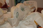 Okay besides the fact that I been working on his diet the longest I have ever been on a diet…well not quite…I did stay on Grey sheet OA for 10 years…and I only worked on that Dr Phil Venus for 2…but OMG.  Yesterday I got to the studio lifted the Dr Phil Venus off the red leatherette chair only to discover she had gone horribly moldy.  Now understand this is the second time this has happened to me.  Last summer I did this huge repair job on her washed her down with bleach and painted the effected areas with Kilz to ensure all was dead…but we are talking since then this piece was a solid mass of his books.  It was like I had turned books back into a tree.  I couldn’t even cut threw it with a saw it was taking forever.  So yesterday in a fit of frustration I cut her head off and will take the uneffected side and the cross section of the head to the show for people to see how the scupltures are made.  All those hours of work. Sob.   Anyhow, those books are gone,…(I forgot to count how many of them I ripped up to make that Venus but I will post that later when I count the book covers.) No one can use them to make themselves feel bad about their bodies or what they put in their mouths again.  What a Blow Hole that man is.  I was thinking how much The Ulimate Weight Solution sounded  like Hilter’s The Final Solution.  Let’s shame all the fat people into killing themselves!  Grrrrrrrrrrrrrrrrrrrrrrrr How’s that working for you?
